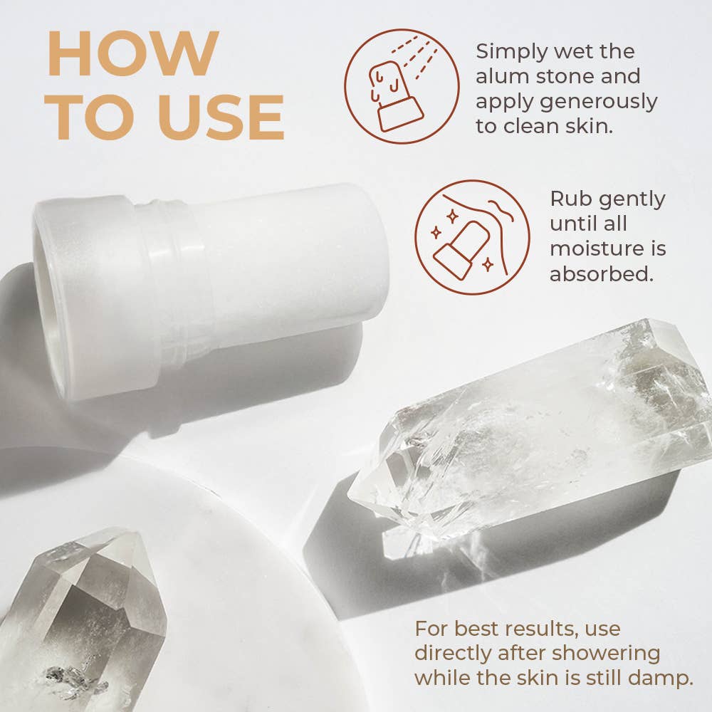 Simply wet the alum stone and apply generously to clean skin. Rub gently until all moisture is absorbed. For best results, use directly after showering while the skin is still damp.